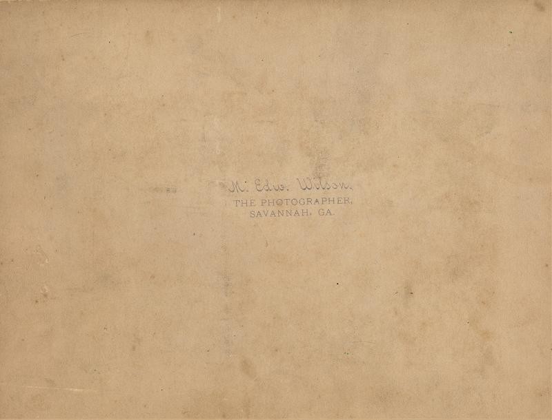 Cabinet style photograph measuring 7 1/2 by 4 1/2 inches mounted on an 8/10 card. Written in pencil at the bottom is The Monitor warship St. Simons Island. Stamped on the back is the photographer's mark M.Edw. Wilson the photographer Savannah, Georgia. M. Edward Wilson operated in Savannah in the late 1800's. I would date this to around the Spanish American War.