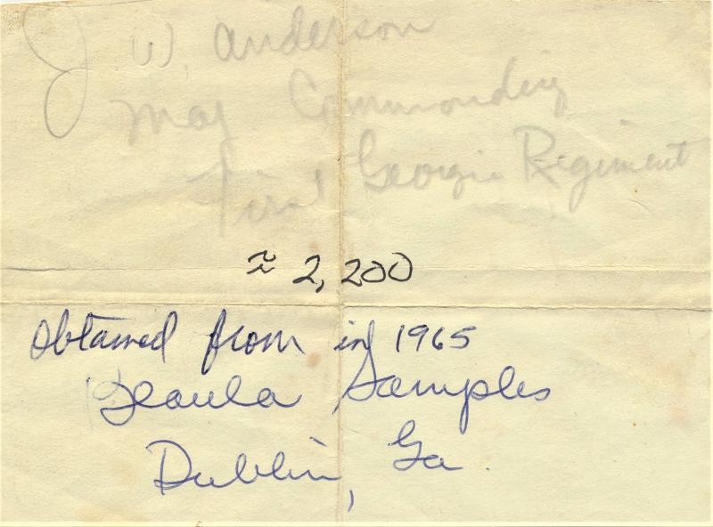A person ordered this and had me put it on hold and never sent payment therefor it has been relisted. Published image on page 188 in even more Confederate Faces of James W. Anderson. James Anderson entered as a 1st Lieutenant in the 1ST Georgia volunteers infantry in March 1862 and until they disbanded after 12 months service. In May 1862 he was commissioned as into the 12th Georgia Light Artillery and rose to the rank of Major. The 12th Georgia light artillery was organized from men of Ramsey's 1st Georgia volunteers. Originally the 12th Georgia Light Artillery served in the department of South Carolina, Georgia and Florida and was active at Fort McAlister, Fort Sumpter and at Battery Wagner. In May of 1864 the 12th Georgia Battalion was transferred to Evans' brigade in the Army of Northern Virginia. In Virginia they would be reorganized as infantry and fought at Cold Harbor and at the Battle of Winchester, Virginia where Major Anderson was wounded through both thighs resulting in his capture. Upon his capture he was imprisoned at Point Lookout, Maryland until his exchange on February 20, 1865. After the war James Anderson returned to his home in Newnan, Georgia and served as Sherrif of Coweta County Georgia. The old Major would pass away on November 15, 1902, at the age of 67 and is buried in Oak Hill cemetery in Newnan, Georgia. A folded piece of paper with the image identifies it as James W. Anderson and indicates it was purchased from Paula Samples of Dublin, Georgia in 1965.