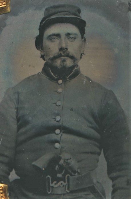 Seated view of what appears to be a Confederate cavalryman with his trusty Colt 1860 Army revolver. Clear image with some hazing around the edges. Housed in a thermoplastic case with 1 tiny crack near one of the hinges.