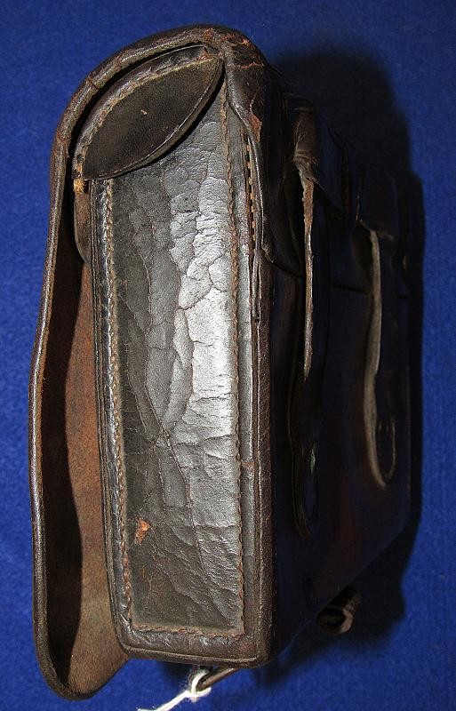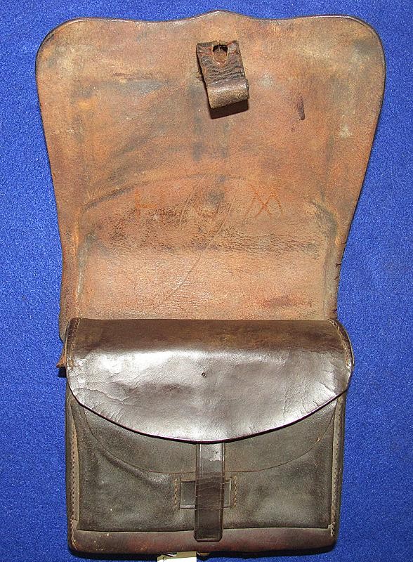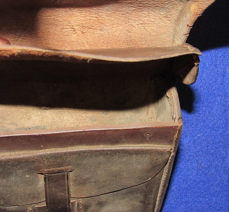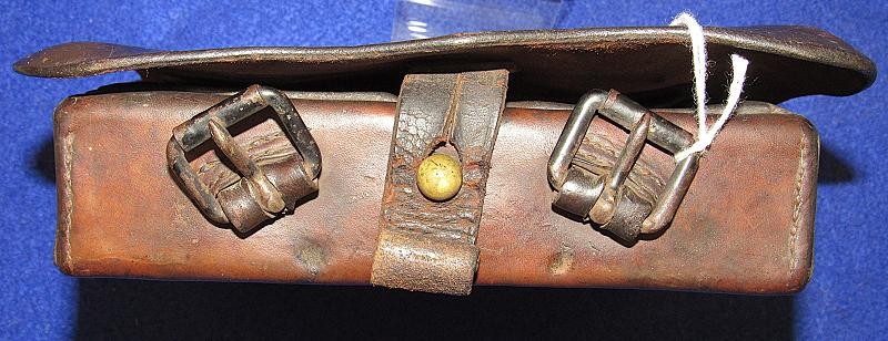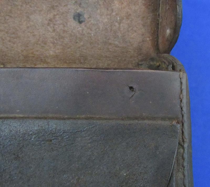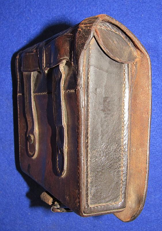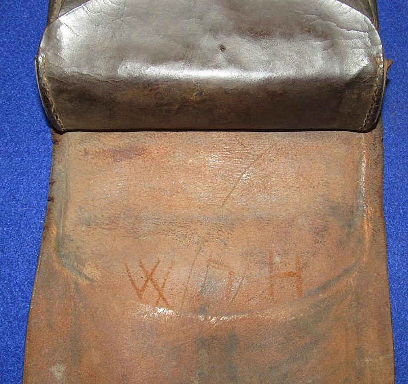 Interesting box with the name W.D. Holland scratched on the front flap. On the inside of the flap are initials WDH. The box resembles a Union with the exception of the round tack holes opposed to the star holes found on most US boxes. The belt loops are sewn and riveted with copper rivets. The box is in fine condition the latch tabs, Roller buckles and brass finial intact. The box is missing the tins otherwise very good. My research finds at least 6 possible matches. South Carolina, Alabama and North Carolina and 2 from Illinois. I doubt even Matlock could figure it out.