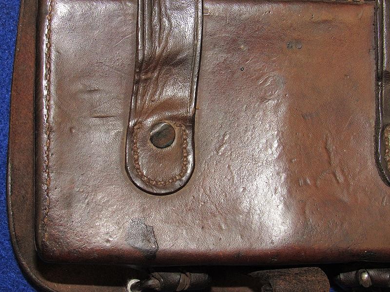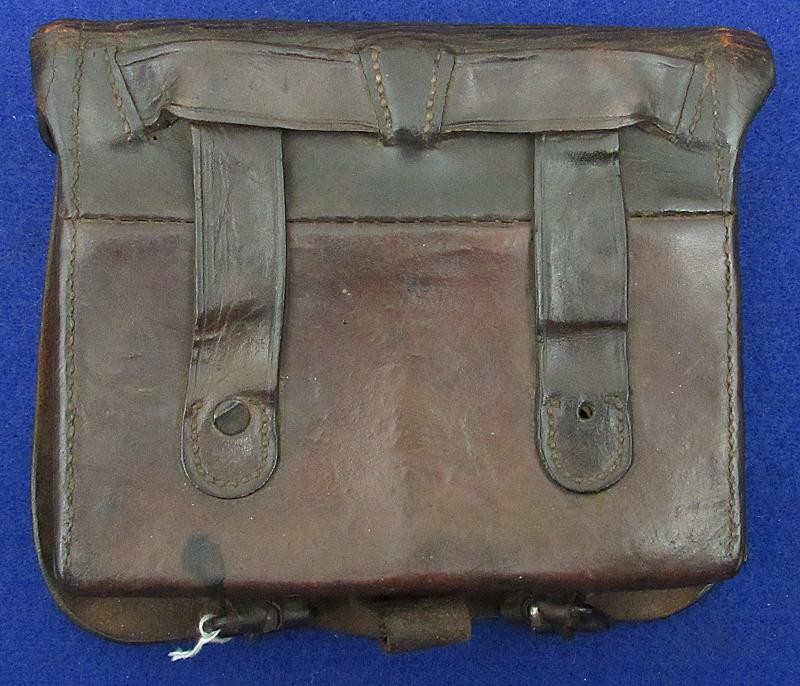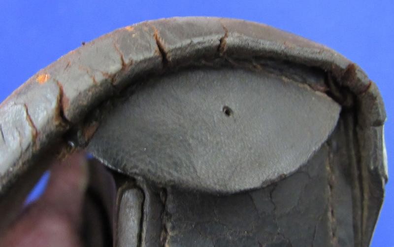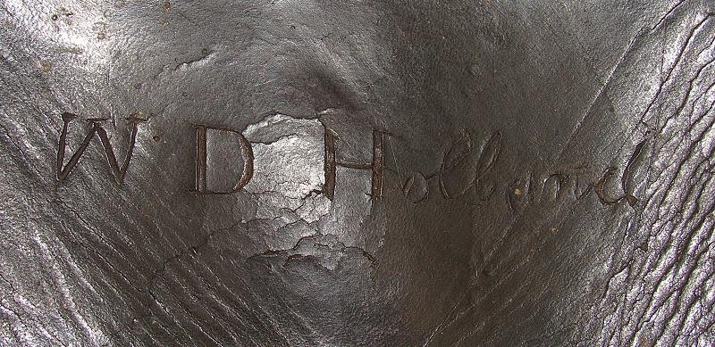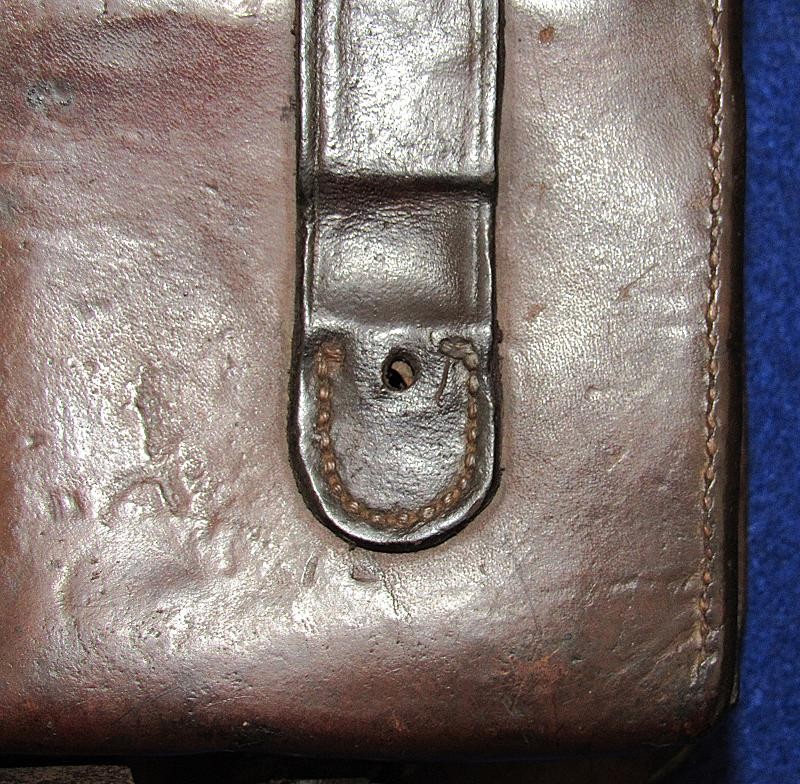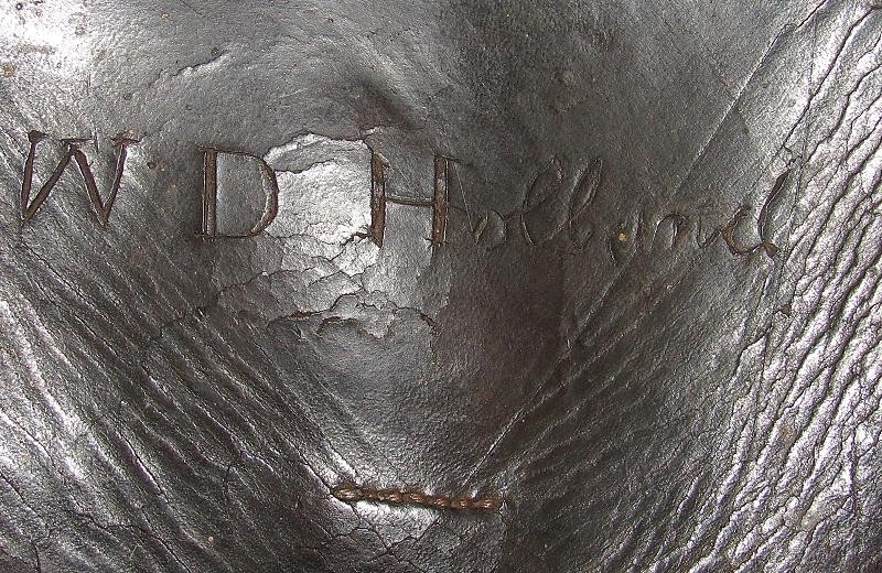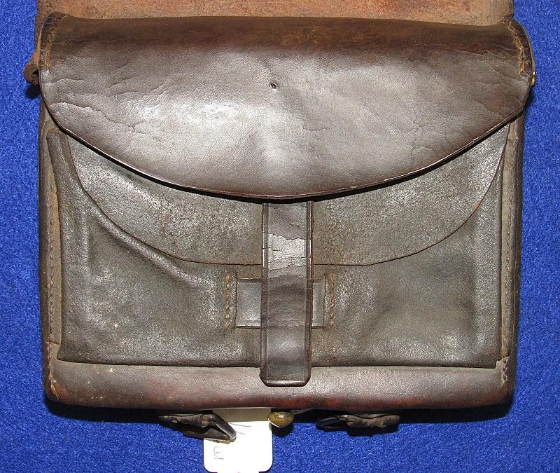 Interesting box with the name W.D. Holland scratched on the front flap. On the inside of the flap are initials WDH. The box resembles a Union with the exception of the round tack holes opposed to the star holes found on most US boxes. The belt loops are sewn and riveted with copper rivets. The box is in fine condition the latch tabs, Roller buckles and brass finial intact. The box is missing the tins otherwise very good. My research finds at least 6 possible matches. South Carolina, Alabama and North Carolina and 2 from Illinois. I doubt even Matlock could figure it out.