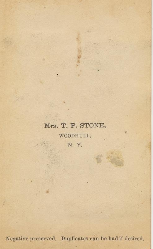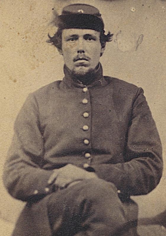 Seated view CDV of soldier made from an original hard image. This image was in a CDV album of the Davis family of Tioga County Pennsylvania. Mrs. T.P. Stone Woodhull, New York