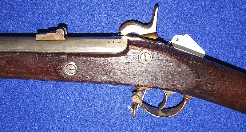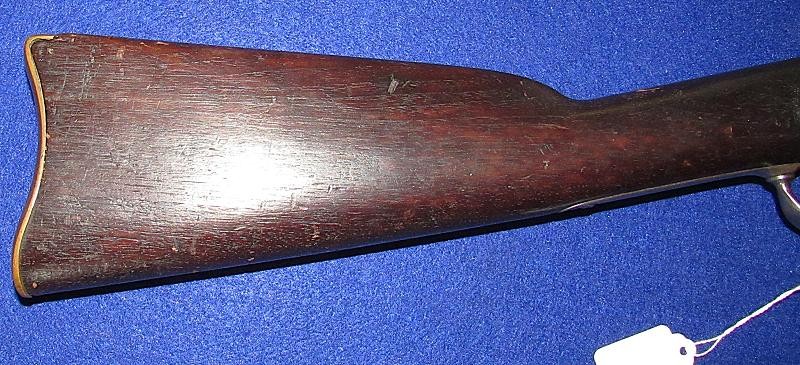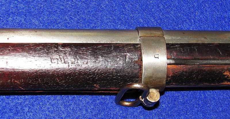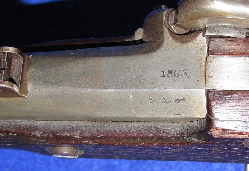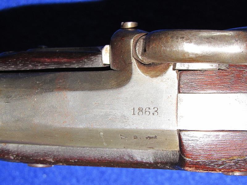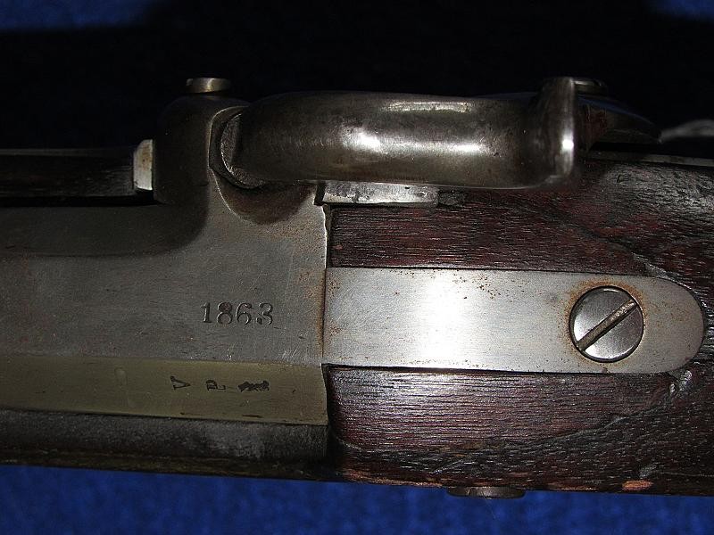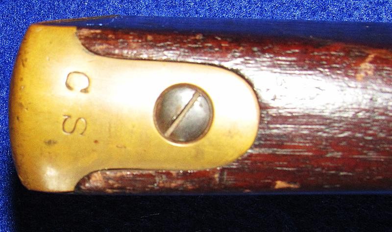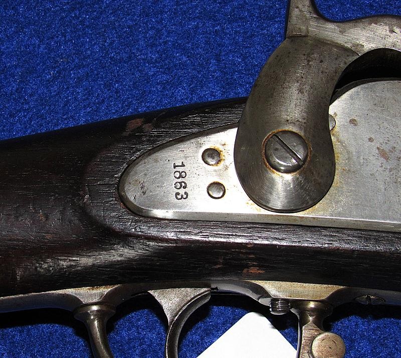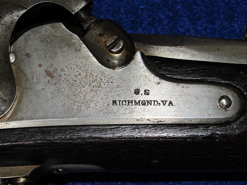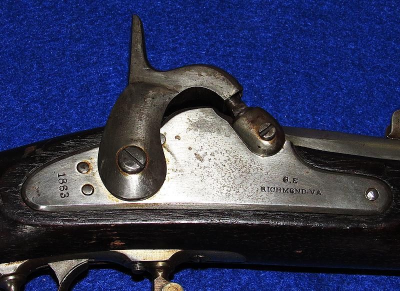 In excellent condition, showing very little use. Barrel and lock dated 1863 with very sharp markings and with a very strong VP over eagle stamping. The brass butt-plate has a CS stamping that appears to be contemporary with the use of the gun. 100% Richmond parts with the typical crude Richmond knurling on the hammer and offset Richmond U on the bands. The .58 caliber bore displays good rifling with very little pitting. The wood is fine with very few nicks and dings from storage. A very old repair is visible next to the barrel tangs, as shown in my photos, and in my opinion, after close examination, it appears to have been done at the time of manufacture at Richmond. The lock plate in-letting displays the typical Richmond mule shoe.
