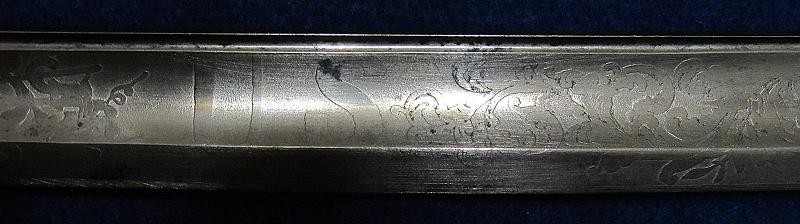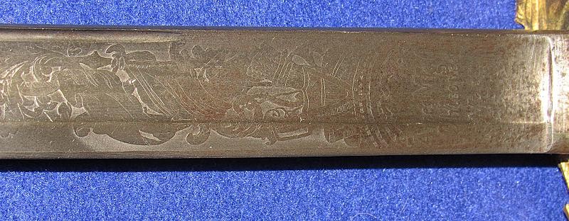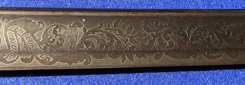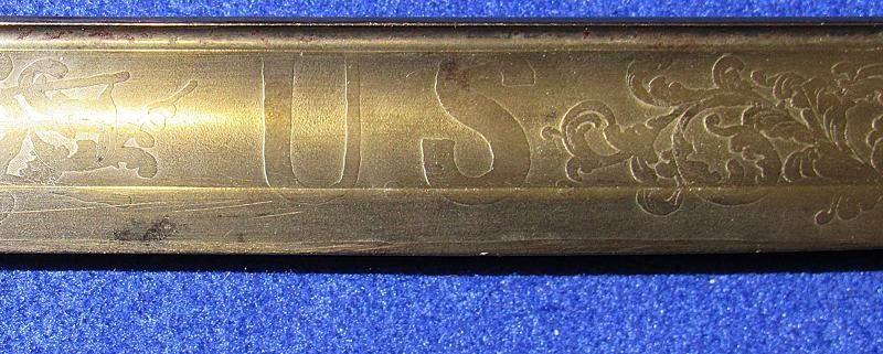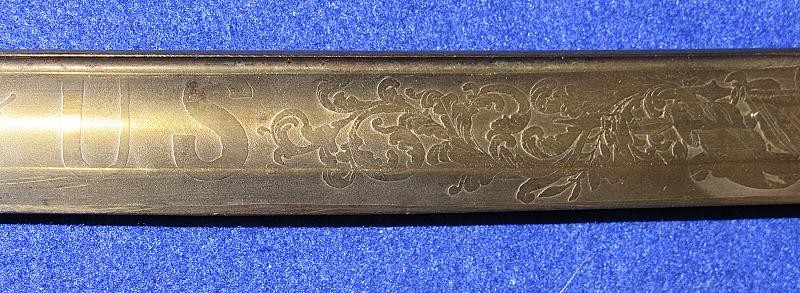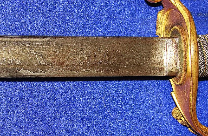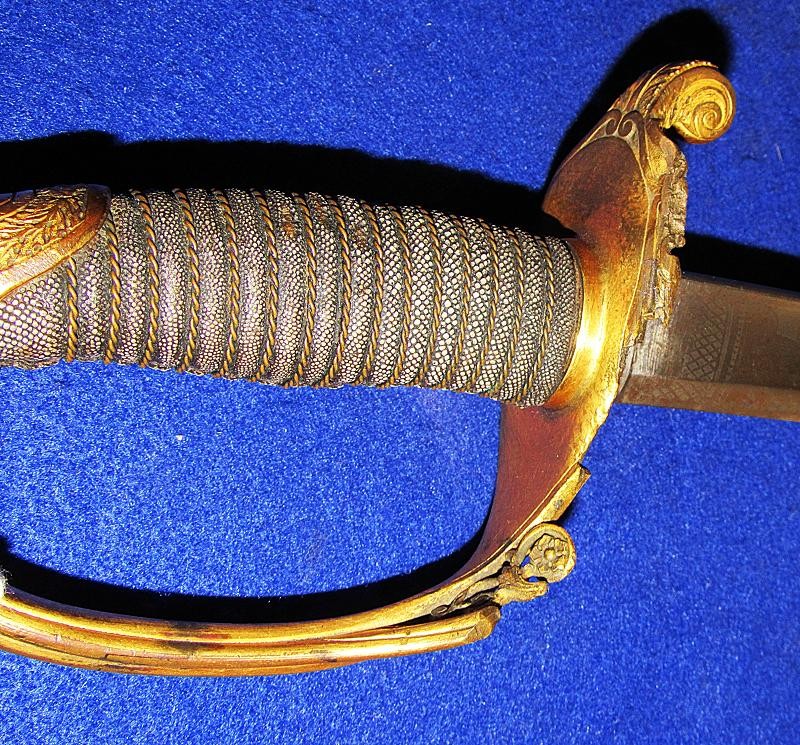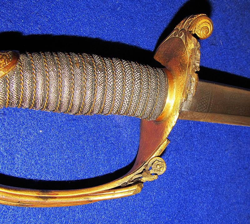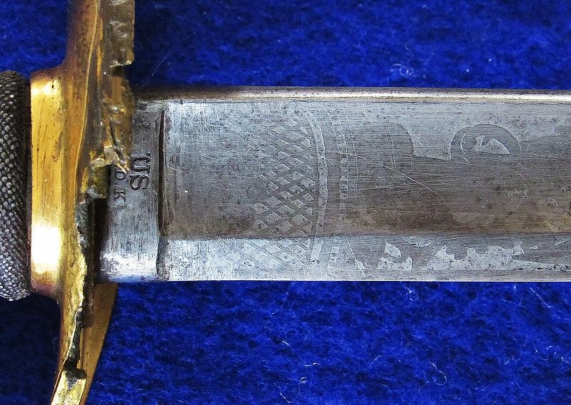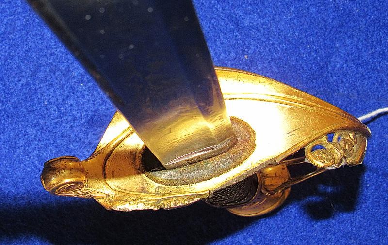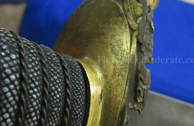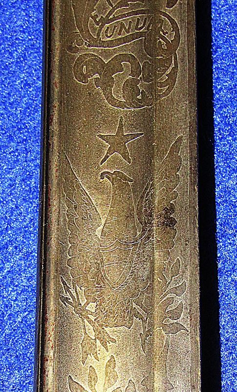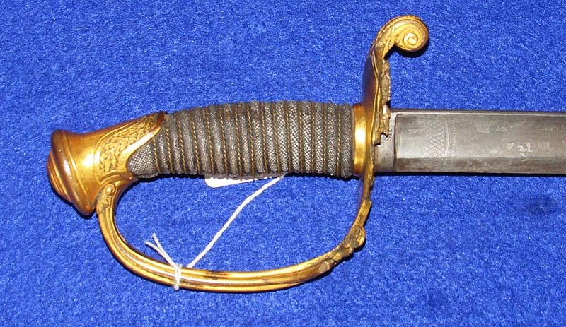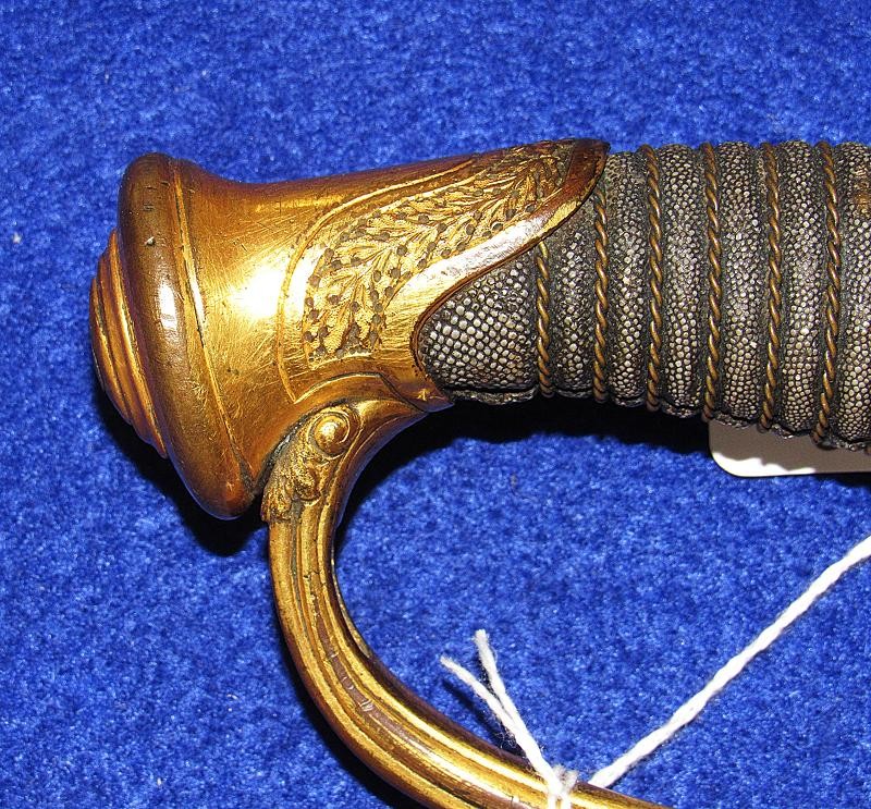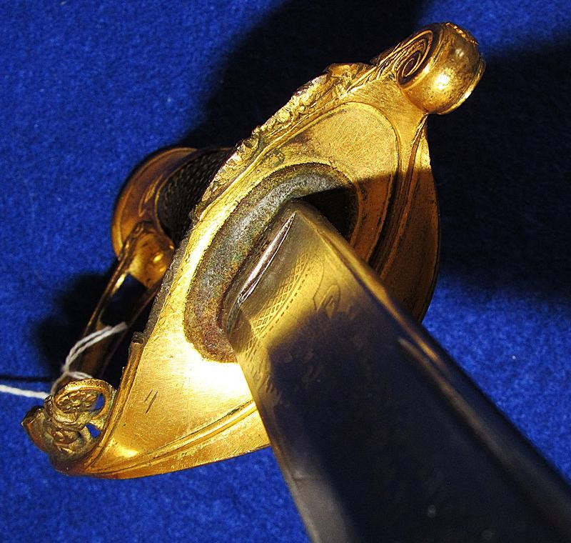 According to noted Ames sword collector and expert Ron Maness, the state of Texas contracted with N.P. to purchase a small number of the 1850-foot officers' swords in 1851. The Ames company was known to have a good relationship with the state of Texas, as evidenced by known examples of the model 1833 artillery short swords with a star on the pommel and 280 model 1833 Dragoon sabers that were purchased by the Lone Star State. This sword is dated 1850, and with a star over the eagle etching on the blade. One could easily argue that this sword is one that went to Texas. To my knowledge, this is the only star over eagle etched Ames sword that I am aware of. Also, the sword appears to have battle damage with part of the hilt missing from a hard hit.