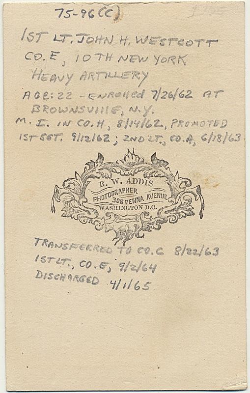 John Westcott enlisted as a private and rose to the rank of 1st Lieutenant. Lieutenant Westcott served the entire war. The 10th New York Heavy Artillery was also known as the Black River Artillery.