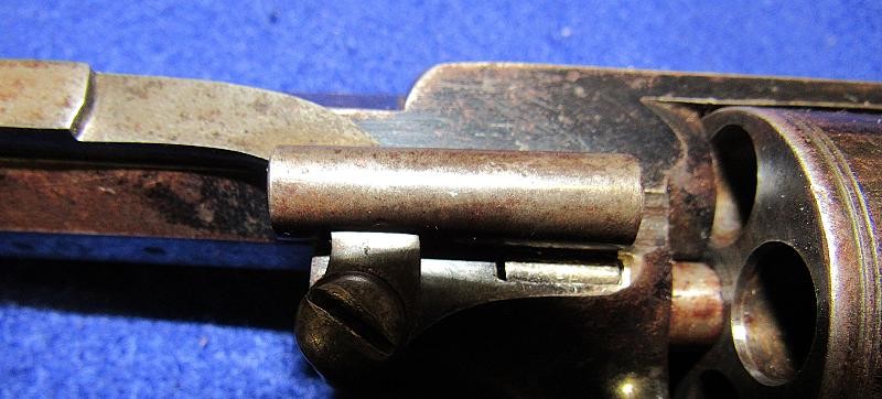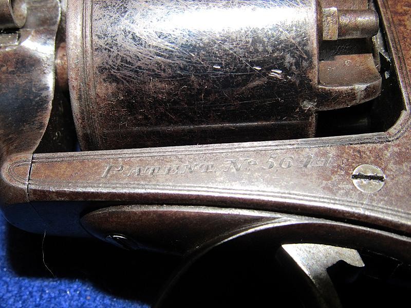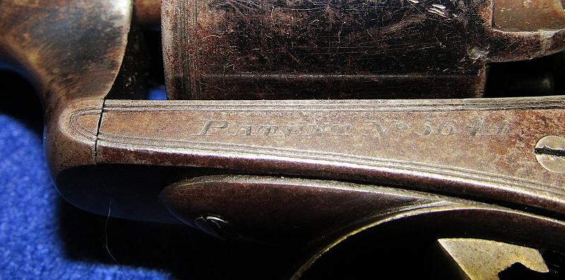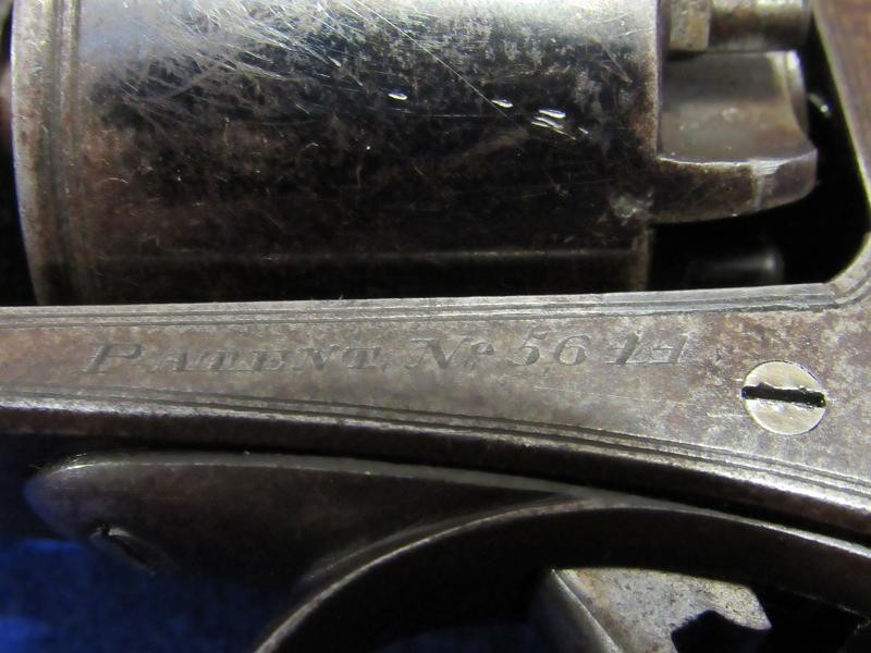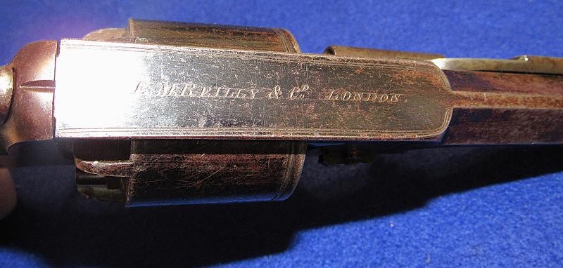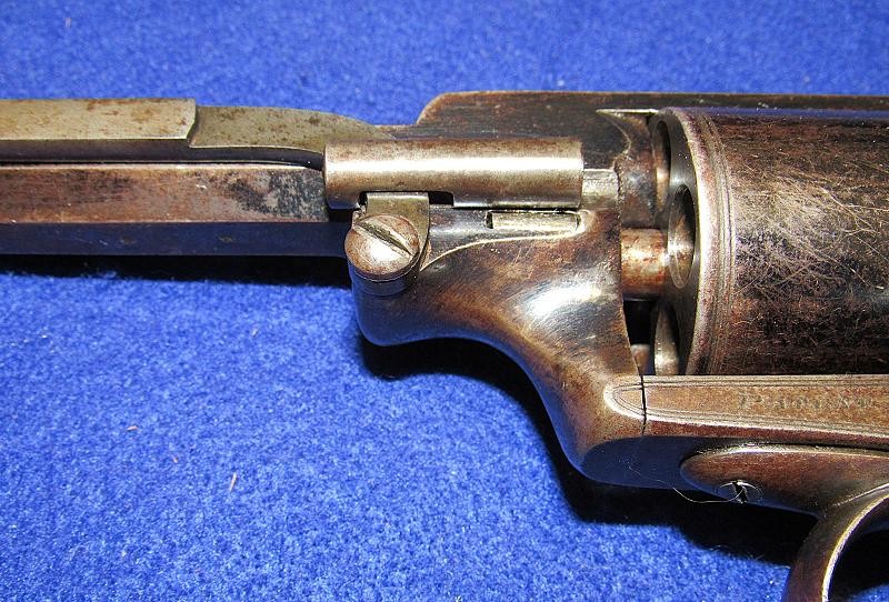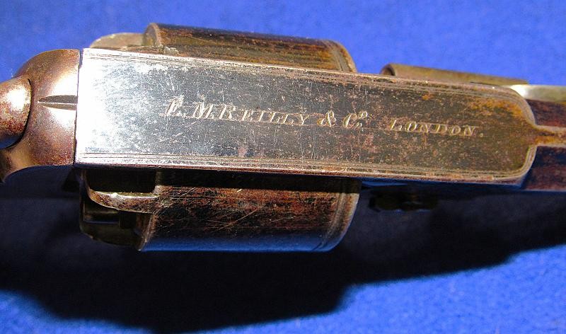 Fine condition revolver in English .54-bore with a generous amount of the original blue remaining. The top of the barrel is retailer-marked E.M. Reilly &. Co. London. The Reilly family were well known gun makers and retailers in London, England, before the Civil War. E.M. Reilly, son of J.C. Reilly, operated as E.M. Reilly & Co. beginning in 1859. According to research by Tim Prince, most of the wedge frame guns from the Civil War period are in the 5,xxx serial range and below. This particular example is serial numbered 5644. It is interesting to note that, according to the Pratt list, a wedge frame revolver serial number 5054 was issued to the 18th Virginia cavalry. According to research by Tim Prince wedge frame revolver serial number 5553, attributed to Captain George Russel of the 54th Tennessee Infantry, resides in the Virginia Historical Society. Could this have been a Confederate blockade gun? It is possible, but we probably never know. With that said, this example is in fine condition with nice wood and the remaining original blue finish. A very nice example of a scarce Adams variant wedge-style revolver.