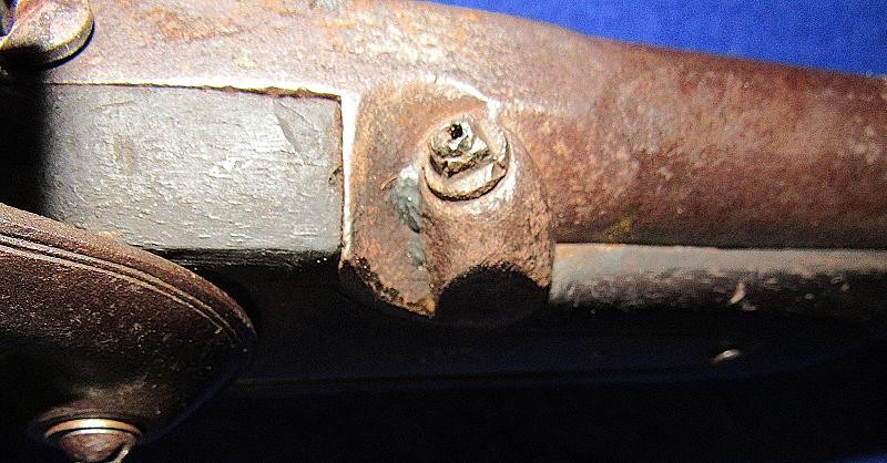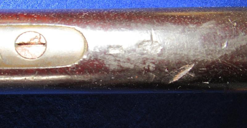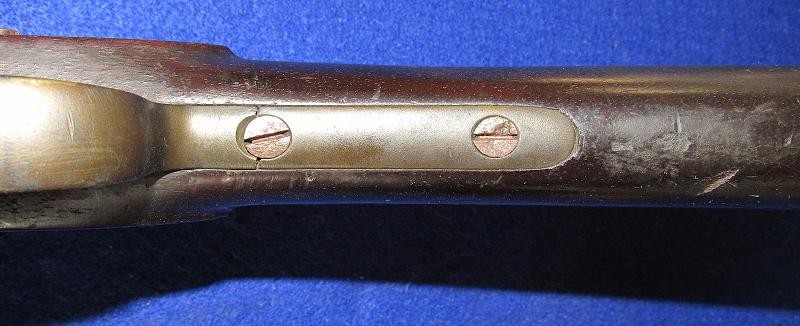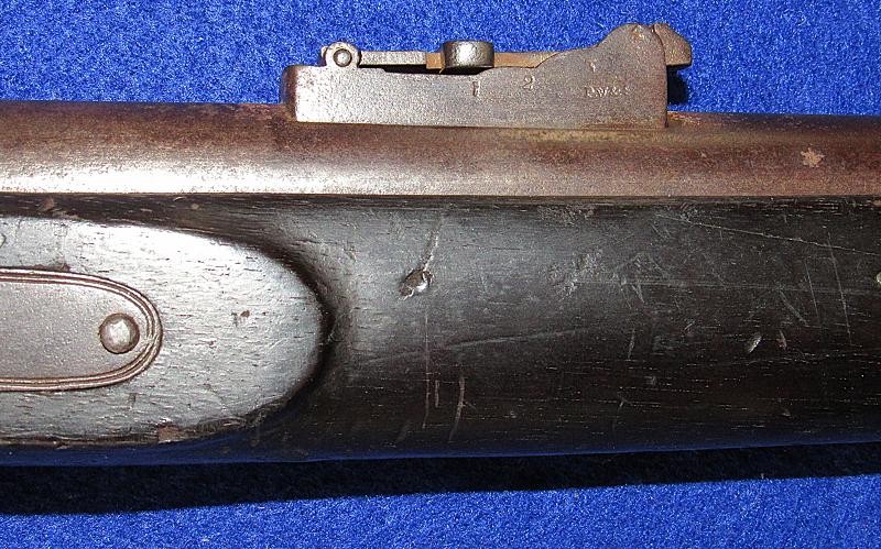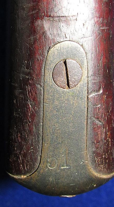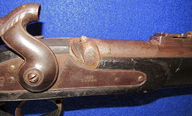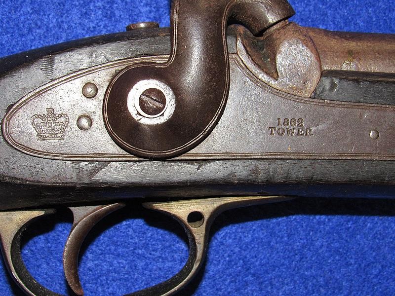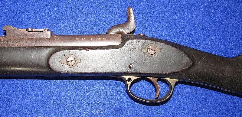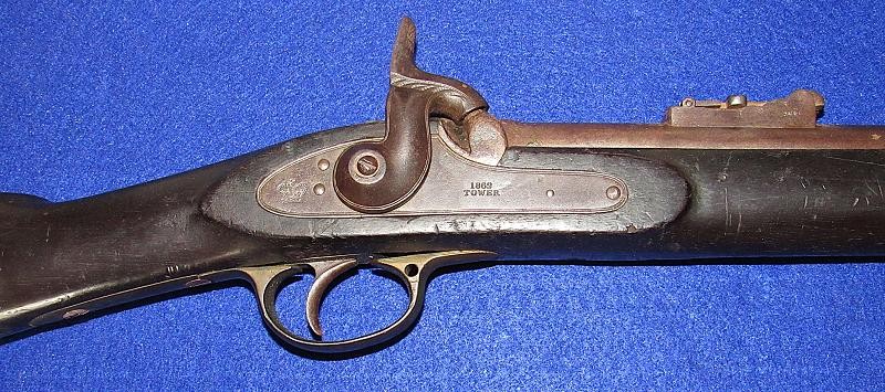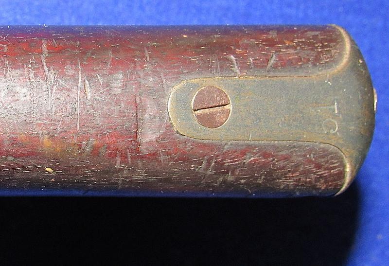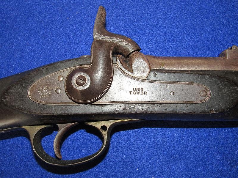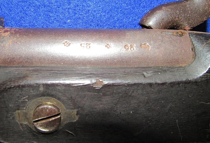 Overall, an untouched black gun, just like I like to find them. Good markings on the lock-plate with the date 1862 over Tower and a crown to the rear. Of particular interest is the number 51 stamped on the butt plate. The blockade ran P-53 Enfields have an engraved number, and on this one, the number is stamped. It is interesting to note that some of the Blockade-run P56 Enfields have stamped numbers in the wood. It could quite possibly be a rack number, but the significance needs additional research.