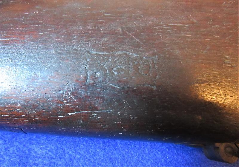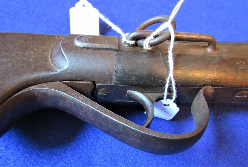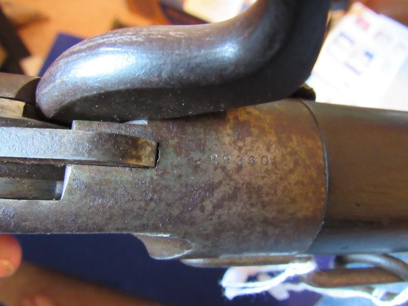 Dark, uncleaned model 1860 carbine serial numbered 29360. Interestingly, this gun is 3 numbers off from a known carbine that was issued to the 6th Michigan Cavalry. The metal parts have a very dark patina with some surface rust and pitting in a few places. The stock has the usual nicks and dings associated with field use. The mechanical action is perfect and operates fine. The magazine is missing from the butt plate.