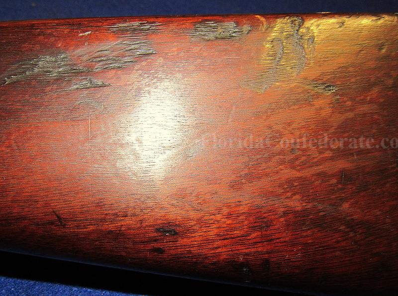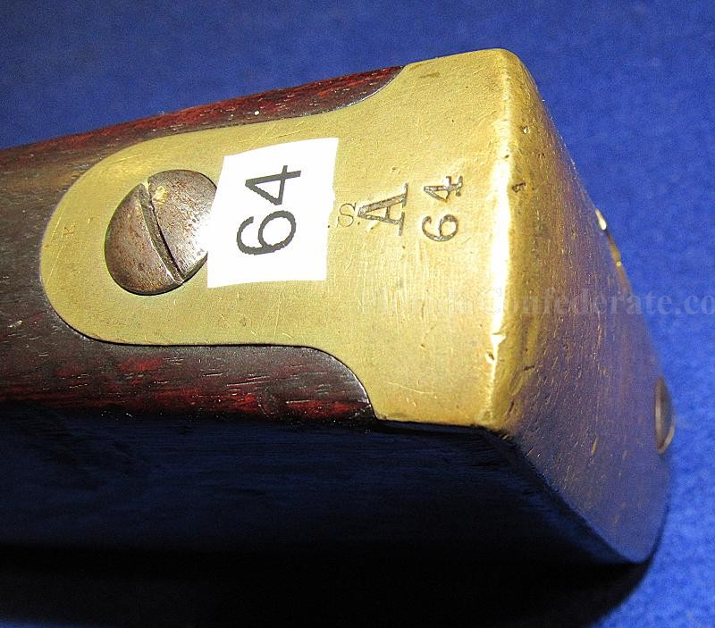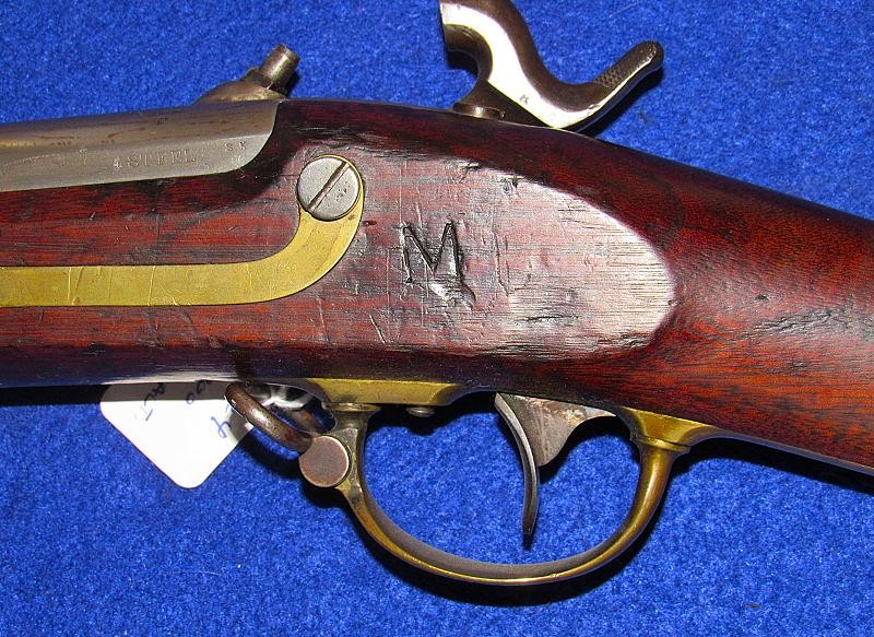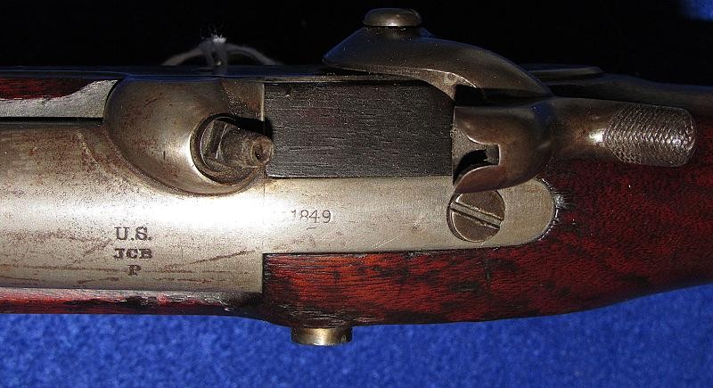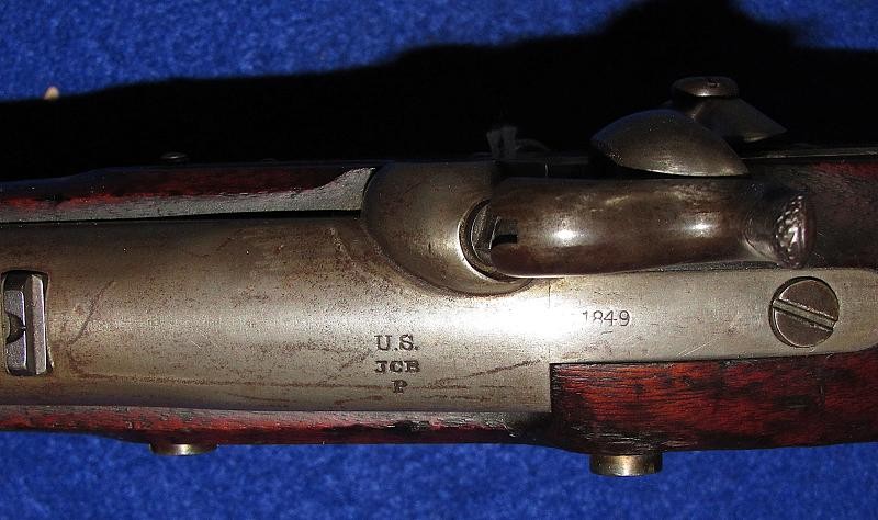 Overall, in fine condition with strong markings on the barrel and lock, and with a matching 1849 date. The iron parts exhibit an overall medium gray appearance. The brass-tipped ramrod appears to be original to the firearm. The wood is good, with several nicks and scraps, and a large scrape on the stock opposite the lock near the butt-plate.
