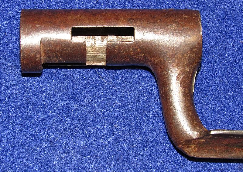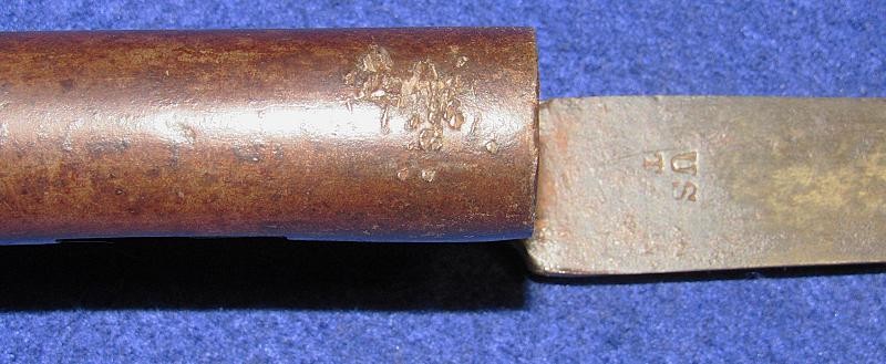 Socket bayonet for the US model 1816 musket. Blade is marked US with T inspector's mark with a .815 bore. The top of the socket has nicks, as shown in my pictures.
