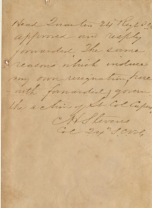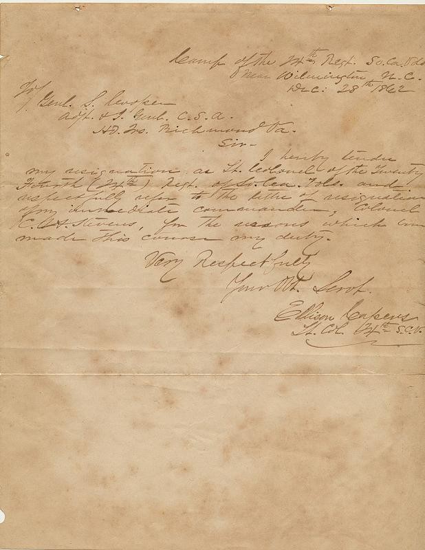 In the letter, dated December 28, 1862, Capers formally tenders his resignation from military service. While the specific reasons for his resignation are not detailed here, such correspondence typically reflected personal hardship, health concerns, or shifting wartime circumstances. The tone of the letter is respectful and formal, consistent with military protocol of the time, and demonstrates the structured chain of command within the Confederate Army. The letter is endorsed by General Sam Cooper and Colonel, later Brigadier Clement H. Stevens of the 24th South Carolina Infantry.