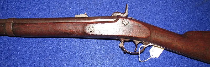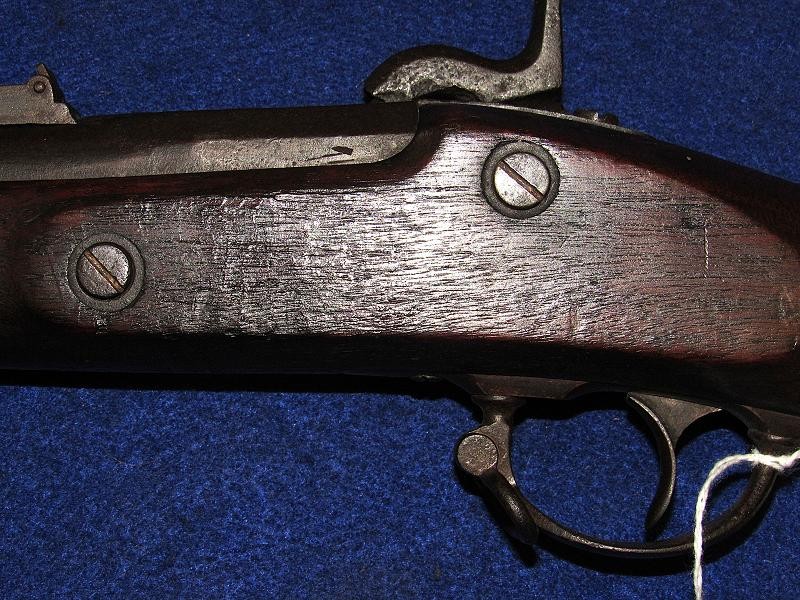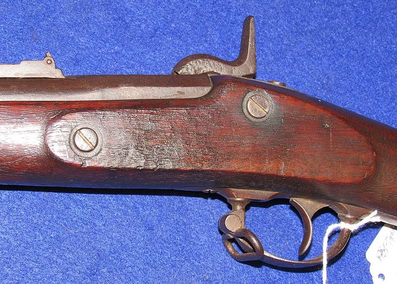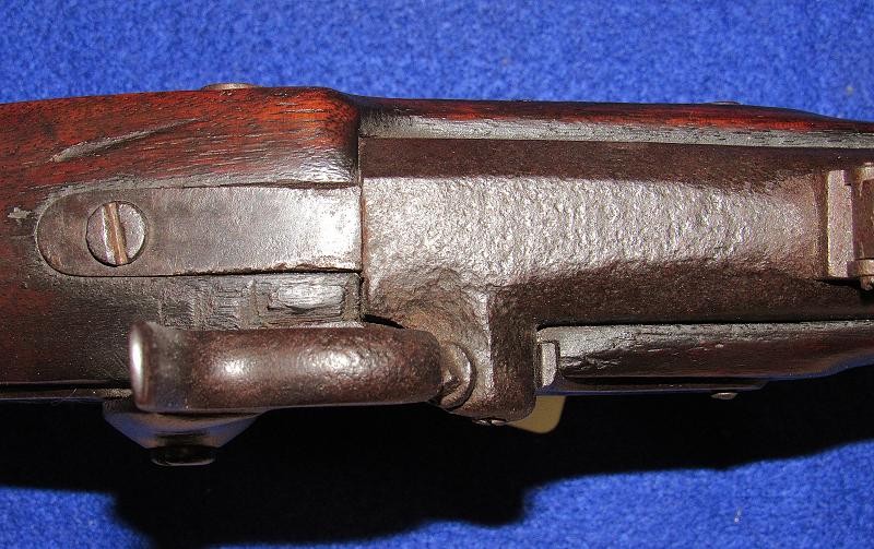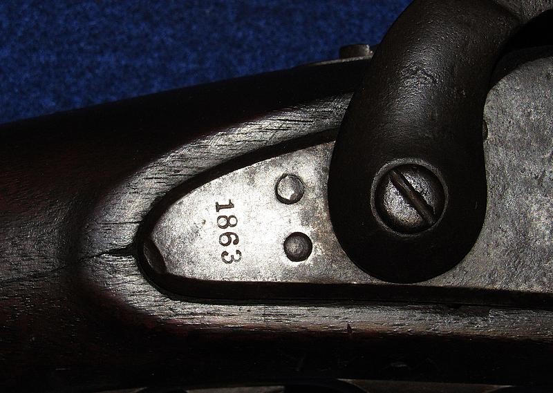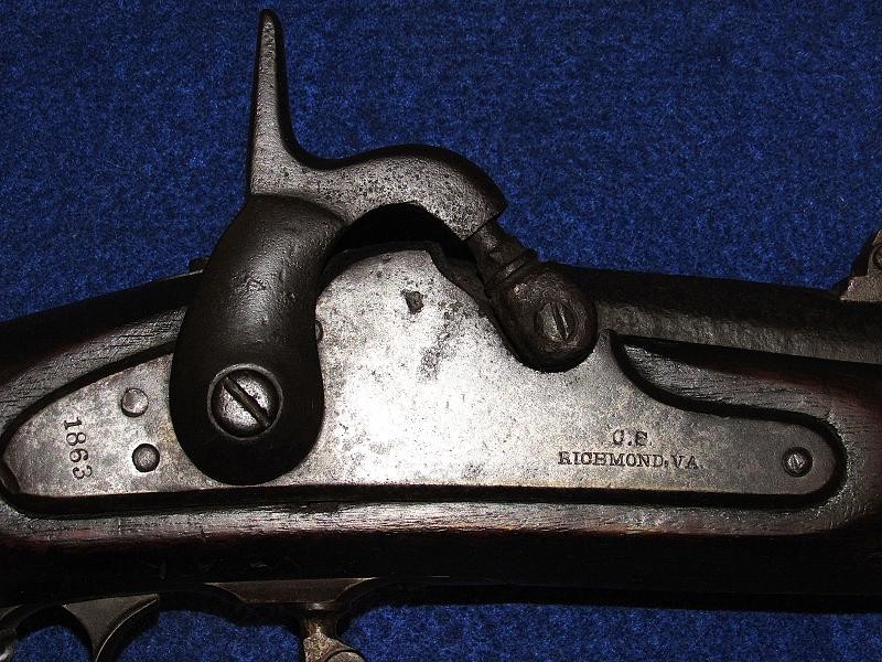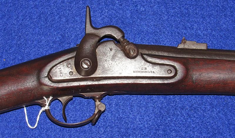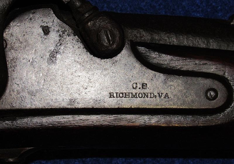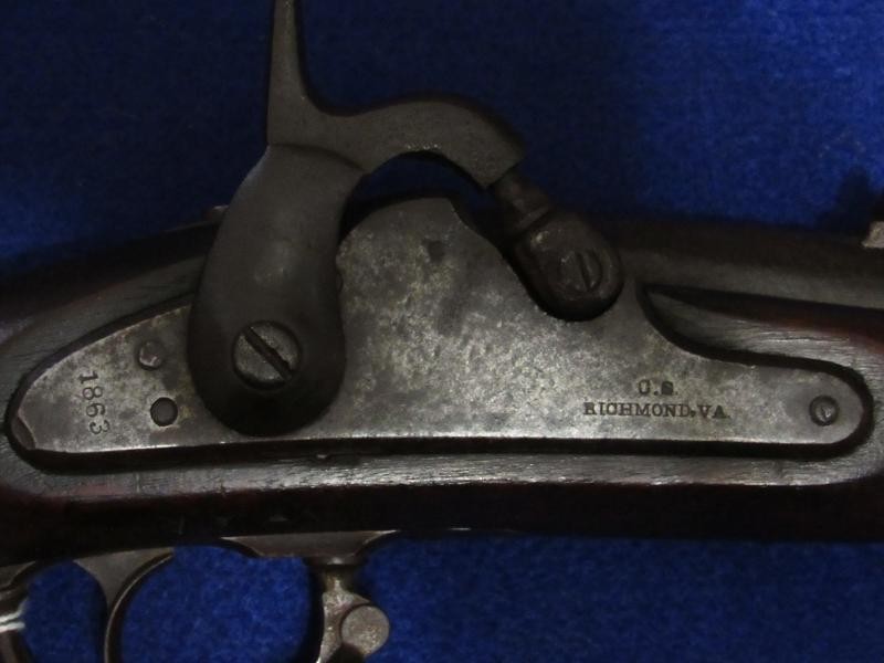 Absolutely, the way you like to find them. Untouched and never been cleaned, and 100% correct in every aspect except for the ramrod, which may be a replacement. High Hump lock nicely marked 1863 and C.S. RICHMOND, VA. Typical brass butt plate and nose cap with a nice patina. The iron parts are black, having never been cleaned, with pitting around the bolster and on the rear of the barrel, as shown in my pictures. The VP and eagle, as well as the barrel date, are not visible. The wood is exceptionally nice as it has never been cleaned with the Richmond in-letting and the non-swelled ramrod channel. On the underside of the lock next to the trigger guard, are the carved initials WAR. The hammer has the typical Richmond knurling. If you listen, you can hear Dixie. From the Kevin Stancavage collection.